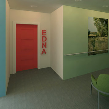 Sunrise Living is a facility for memory care patients that aims to uplift residents through bright colors, natural light and open spaces. The common living space is framed by large windows to bring in natural light and views of nature from the enclosed garden. The room consists of seating areas for residents to socialize with one another or visitors. There is an electric fireplace with shelves on either side that store books, puzzles and board games for residents and guests. Residents are given personalized room entrances with their name next to their door in a matching color. Rooms are easy to find through wayfinding which is applied with the use of landscapes of nature and paintings of animals to help guide residents and visitors through the facility. The images allow residents to remember where their room or another public space is located along with providing them with a calm and serene scene.
