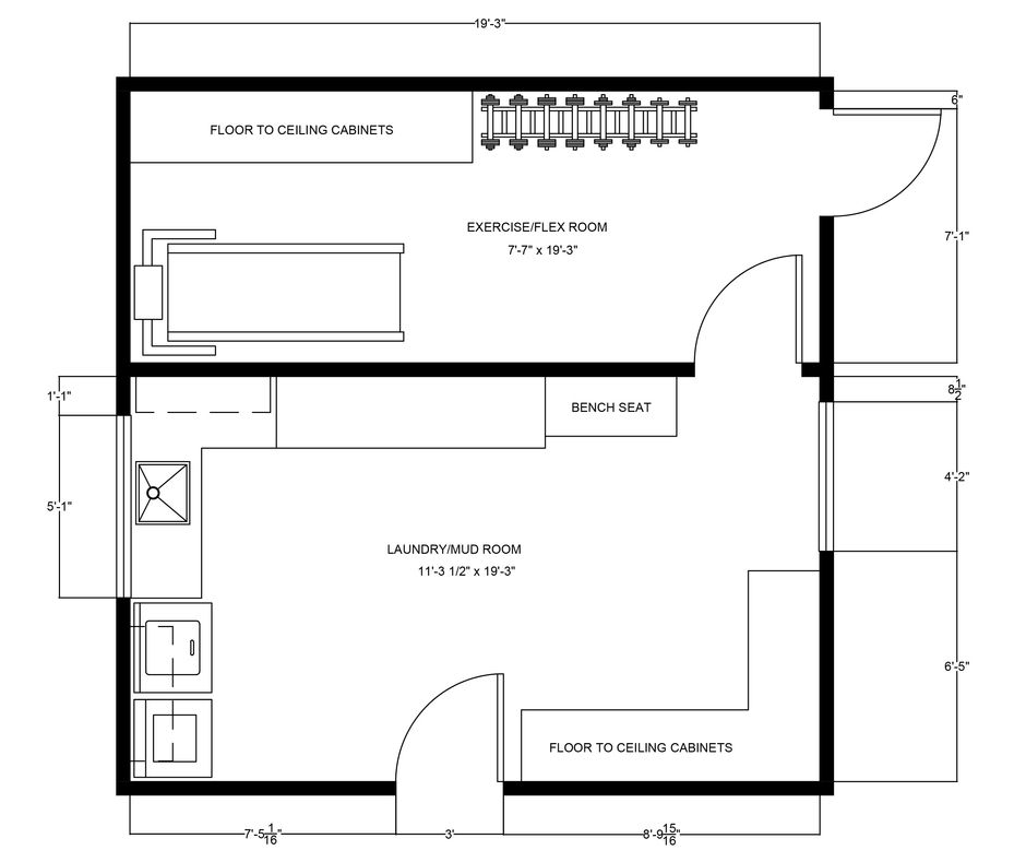 What was once a garage is now a room for laundry and storage. The space also includes custom shelving and cabinets that provide hidden storage for large items and small equipment. The room is split into two and the second includes room for exercise equipment and additional storage.